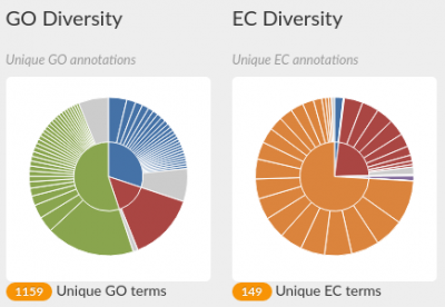 This brings us to the next part of this tutorial in which we are going to explore the structural and functional diversity of the HUP superfamily using CATH. The structure and function of a protein are closely linked, so it is natural to assume that structural diversity is likely to result in functional diversity within a superfamily. Sections 2 and 3 on the homepage (see below) gives information on the functional diversity and lets you view the distribution of GO annotations and EC numbers associated with this superfamily. Placing your mouse over one of the pie segments gives the EC number or GO term, the name of that function and also the incidence of the functional annotation in question within the superfamily as a percentage. There are currently a total of 1159 GO annotations and 149 EC annotations for the HUP superfamily.