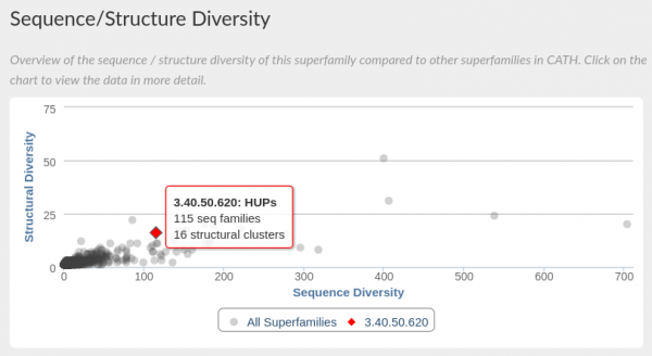 The Sequence/Structure diversity chart (Section 10) can be used to compare the sequence and structural diversity of the HUP superfamily with all of the other superfamilies in CATH. The HUP superfamily is highlighted in red and the number of sequence families and structural clusters it possesses compared to other families in CATH can be determined by mousing over the graphics representing each family. This shows that the HUP superfamily is more diverse in terms of both sequence and structure than most other families in CATH (see picture below)